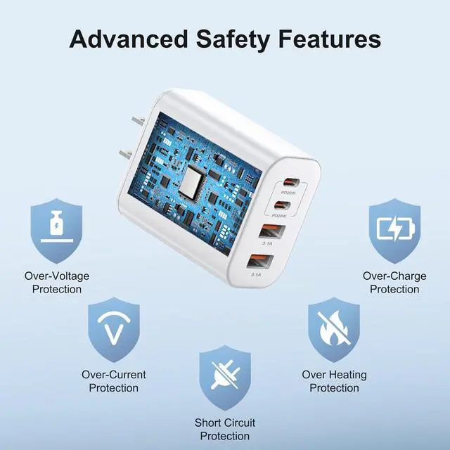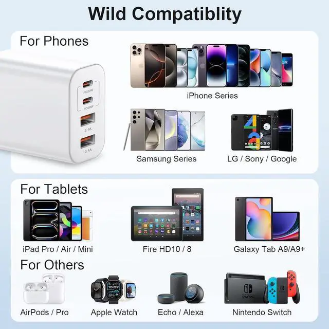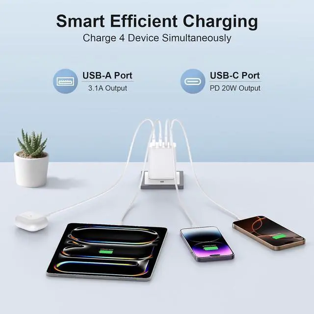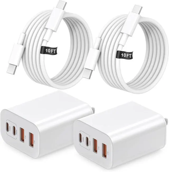 USB-C Port: Supports 20W fast chargingideal for iPhone 16/15 series letting you juice up from 0% to 50% in just 30 minutes. Universal Compatibility4-Port PD + QC power adapter compatible with iPhone 16/15/14/13/12/11/Pro Max/XS/XR/8/7/Tablets MacBook Air 13inch/MacBook Air 2018 and later Mac Book Retina 12 inch/MacBook Pro 2016 and late iPad Pro 12.9 inch/6th/5th/4th/3rd generation iPad Air 5th 4th iPad Mini 6 iPad 10th for Galaxy S23 S23+ S23 Ultra S22 S21 S20 S10 and more. 10ft Extra Long CableIncluded 10ft USB-C to C cable offers unmatched flexibility for charging from a distance. Whether youre on the couch at your office desk or in the car you wont be tied down by short cords. Made with durable materials it lasts 5x longer than standard cables resisting fraying and wear even with daily use. Safe and