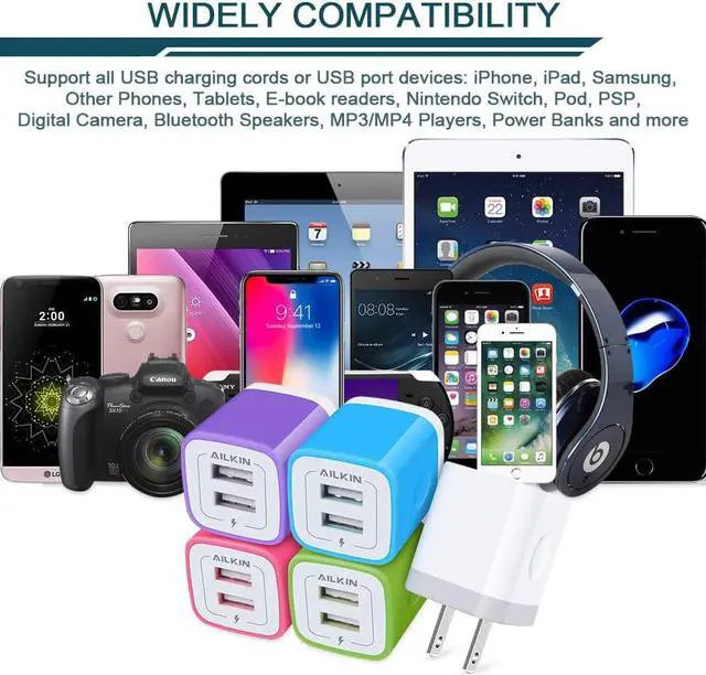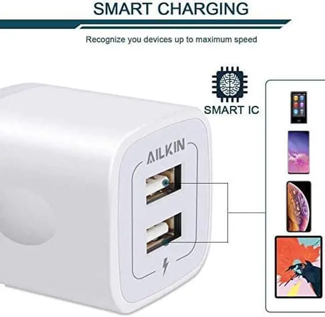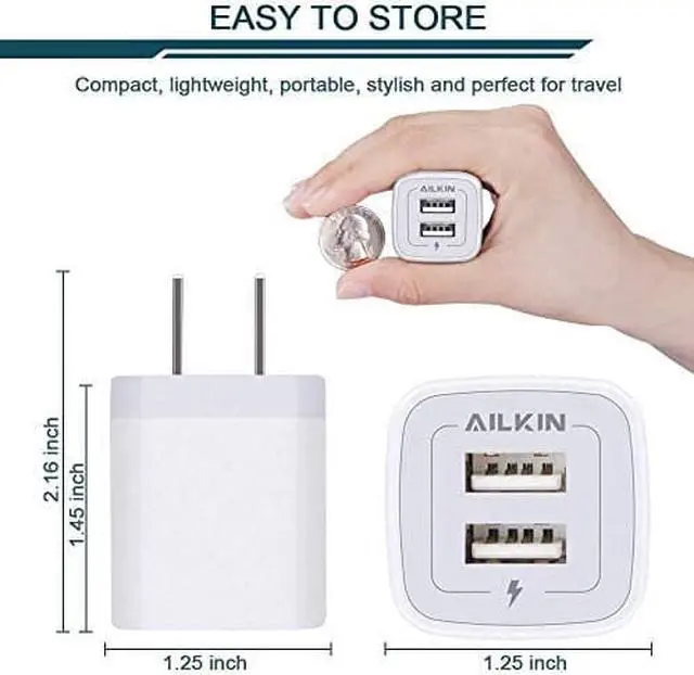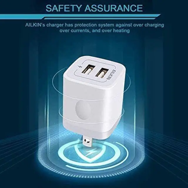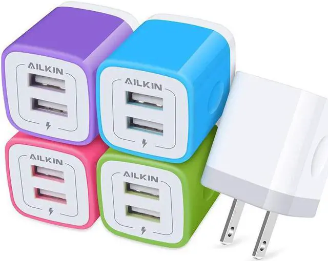 Unique Shape: ABS + PC fireproof material with the confirm connection system you can make sure your digital devices are always charged. Simply plug in the USB cable and plug the adapter into the wall. Compact lightweight portable stylish and easy to store. ONE FOR ALLAILKIN's power brick box works with all the latest mobile USB devices. It is the best replacement wall charger adapter for iPhone Air 17 16e 16 Pro Max 16 Pro 15 Pro Max 15 Pro 15 Plus 14/13/12/11 Pro Max Mini SE XR XS MAX XS iPad Pro iPad Air and iPad mini. Galaxy Note 20 Ultra Note10 Plus 9 Galaxy S25 FE S25 Ultra S24 S24+ S23 S22 Ultra S21+ S20 S10 5G Google Pixel 10 9a 9 8a 8 Pro 7 7a 7 6 Pro 6a5 5a 4xl 4 4a 3xl 3a 2xl HTC Moto Kindle Fire HD 10 9 8 etc. PACKAGE INCLUDE - 5Pack 2 Port multi-colored bulk USB wall chargers set. AILKIN 1 Year hassle-free warranty(refund/replace)