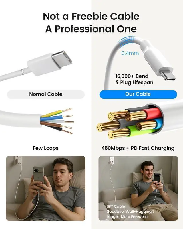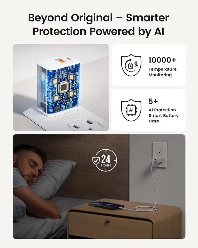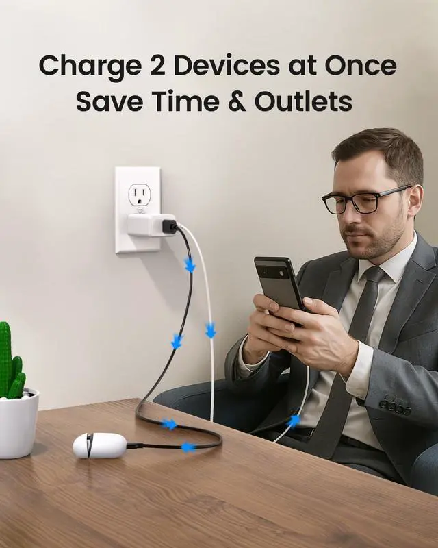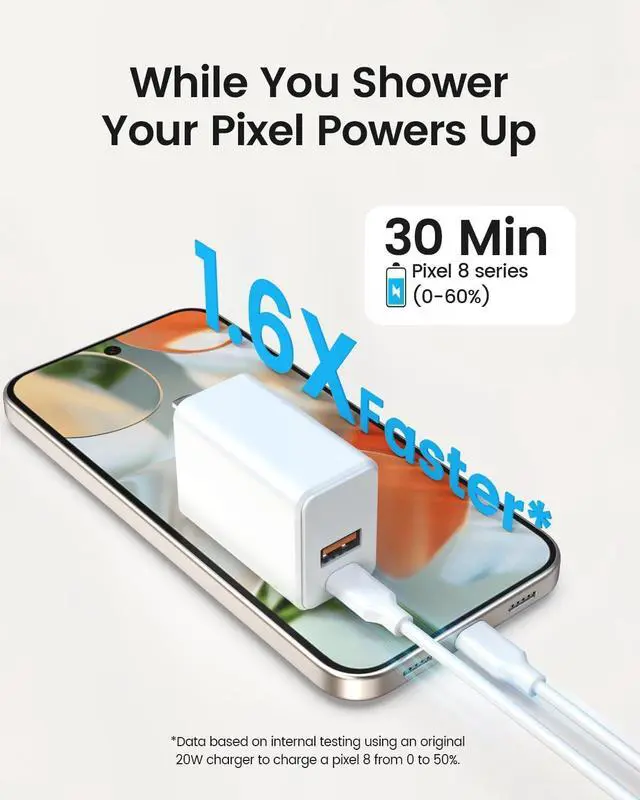 Smarter Charging Longer Battery Life The built-in AI chip automatically adjusts power based on your phones temperature and battery status. Less heat safer charging and a battery that lasts longerFast Charging Fit for Pixel Delivers up to 60% charge in just 30 minutes with official PD 3.0 fast charging. Perfect fit for Pixel 9/8/7/6 Pixel Fold Buds Watch and Other USB-C DevicesCharge Two Devices at Once Power your phone and earbuds at the same time. One charger two devices no outlet sharing no waitingExtra-Long 6FT Cable Included Flexible and durable USB-C cable for fast charging and data transfer.