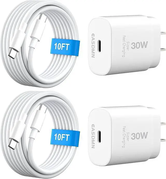 3X Faster 30W Charger for i Phone 15/16 SeriesThis usb c charger adopts newest PD 3.0 fast charging technology provides maximum 30 watt output power much faster charging speed than 20W charger. In just 30 minutes fast charge for iPhone 15/16 series to 68% charge for i Pad series up to 45% 3X faster than original 5W charger. 10FT Extra Long USB C to UCB C i Phone 15 Charger Cord With 2 pack 10 FT fast charger cables that equipped with smart chip and high quality copper core it ensures a rapid 3A charging speed and 480Mbps data transfer speed.