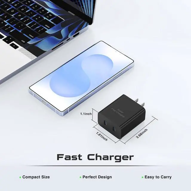 Wide CompatibilityThe c chargers fast charging supports most of most of USB C devices including Galaxy S25/S24/S23/S23/S22/S21/S20/S10 (Ultra Plus) Galaxy Tab S9/S8/A9 iPad 10th iPad Pro 13/11/ 12.9 inch (3/4/5/6th) iPad Air 4/5/6 iPad mini 6th iPhone16/15. Safe ChargingThis type c charger has built-in multiple protection systems to avoid over-voltage over-current over-charging over-heating short-circuit and other problems. What's Included? 2*45W USB-C Dual Port C Charger Block.? 2*6FT C to C Cable Fast Charging.? Backed up by our worry-free 18-month warranty and 24/7 friendly customer support.