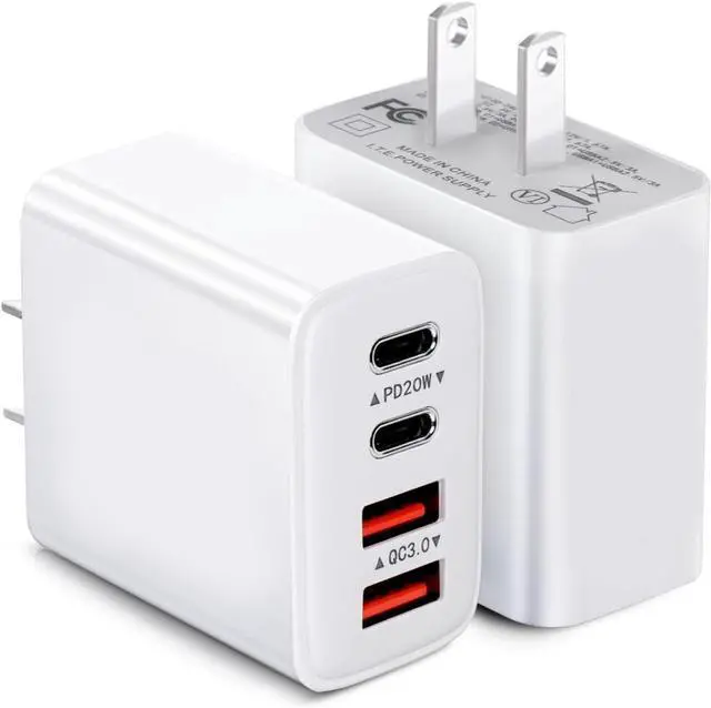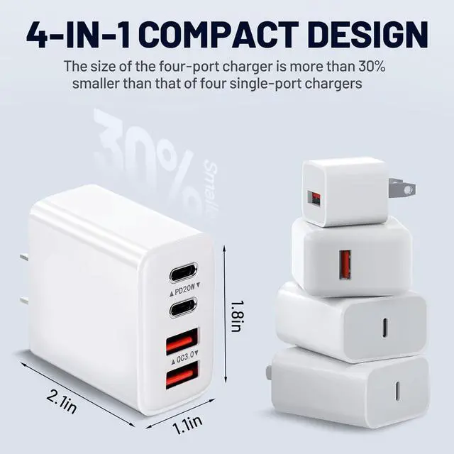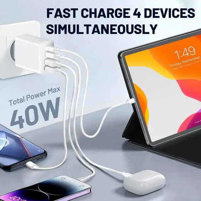 2-Pack 4-ports Charging BlockThis 40w Charging Block Multiport wall charger has 2 USB-C ports and 2 USB-A ports. It can fast charge you multiple devices at the same time including cell phones Iphone tablets mobile power and headphones and game consoles etc. It minimizes waiting time and saves you a lot of space and making your desktop more tidy.