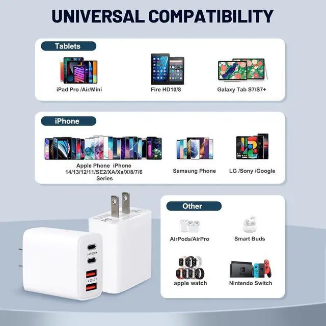 ChargerUniversal Compatibility: This type c wall charger isalmost all electronic devices charging adapter for iPhone 16/16 Pro/15/15 Pro Max/14/13/12/11/SE3/XR/XS Max/X/8 Plus iPad Air/Pro/Mini Galaxy S24/S23/S23/ S21 Ultra Tablet PC Tablet Google Nexus Tablet and other digital devices. Compact and PortableThe compact design of this charger makes it easy to carry with you wherever you go ensuring you always have power on the move. If you have any problems with the charger block please feel to contact us.