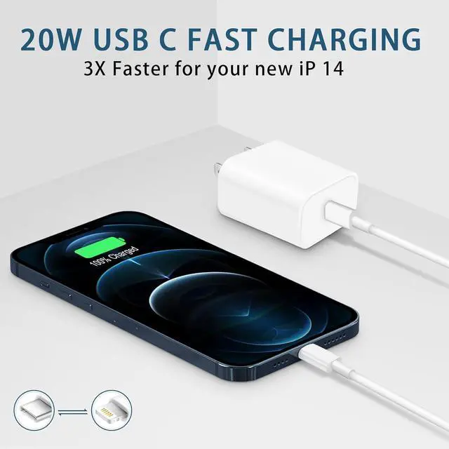 Ultra-Fast ChargingThe 20W USB-C fast charger with a 6-foot charging cable charges your i Phone 14 up to 50% in just 30 minutessaving you over an hour compared to the original 5W charger. MFi Certified Charging CableEquipped with an original MFi-certified chip the USB-C cable features automatic device recognition allowing you to connect your phone directly to a computer for 480 Mbps high-speed data transfer and enjoy 100% flawless compatibility with A pple devicesno warning messages or connection errors. Safe & Efficient Fast Charginguards against over-voltage overcharging overheating and other risks. The smart chip in our MFi-certified cable automatically adjusts current to match your device's requirements delivering fast yet safe and stable charging.