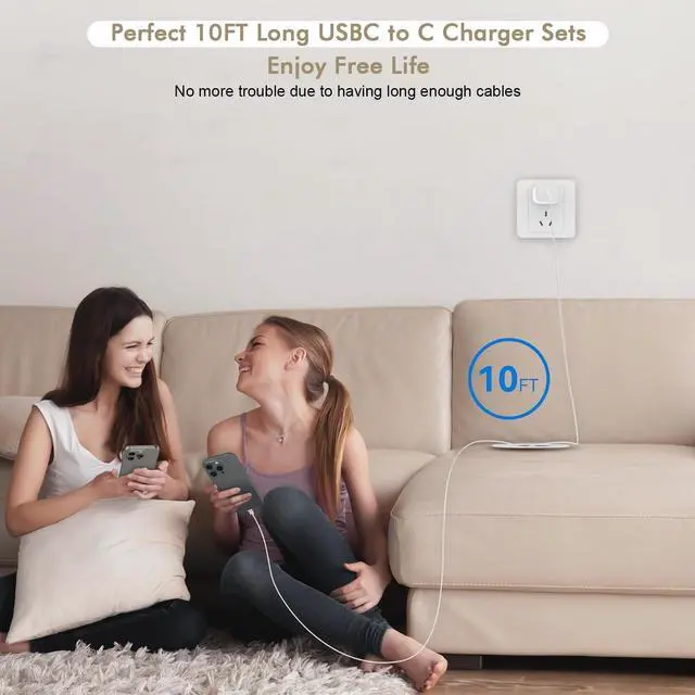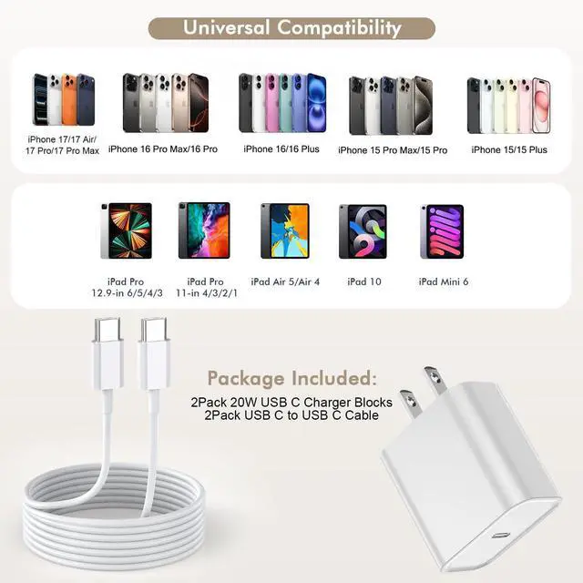 The usb c charger ensures your charging safety and the health of the device's battery10FT iPhone 16/15 charger Charging Cable The 3-meter 60W 10FT Extra long usb to usb c data cable supports fast charging for your USBC devices such as iPhone 17iPhone 16iPhone 15 or iPad 10 and type c charger fast charging cable also supports up to 480Mbps data transfer between two USBC devices such like iPhone 16 and MacBook Air 13inType C Wide CompatibilityUSB C charger block Perfectly compatible with all USB C interface devices as iPhone 17 iPhone Air iPhone 17 pro iPhone 17 pro max iPhone 16/16 plus/16 pro/16 pro max/15/15 plus/15 pro/15 pro maxiPad11/10 iPad air 4/ 512.9 inch iPad pro 3/4/5/611 inch iPad pro 1/2/3/4iPad mini 6/A17 Pro11/13 inch iPad Air (M2) /iPad pro (M4) AirPods 4 2AirPods max Galaxy Note 10+/10/9/8/Z Fold 6Galaxy S24/S23/S22 Ultra/Plus/S21/S21Ultra/Plus/note 60/S60 etcWhat you get 2x PD 20W iPhone 17/16/15 fast charger plug and 2x 10FT USB to USB C data cables.