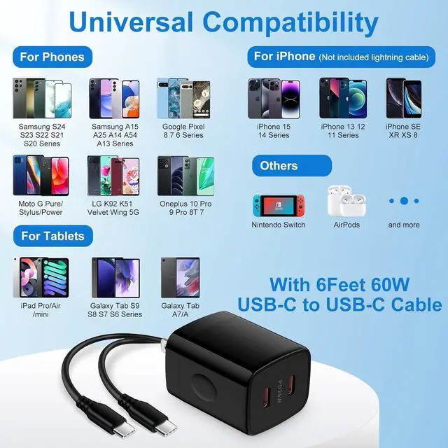 Compatibility: Fast phone charger box type c fast charges for all USB devices. iPhone 16 Pro Max 16 Plus 16 Pro 16 15 Pro Max 15 Plus 15 Pro 15; Galaxy A17 S25 Edge S24 Ultra S24+ S24 A15 5G A15 A55 A35 A25 A14 5G A24 A54 A34 S23 Ultra S23+ S23 S22 S22+ S22 Ultra S21 S21 Plus S21 FE S21 Ultra S20 Ultra S20 FE 2022 S20 Plus A04s A03s A02s Z Fold 6 5 4 3 Z Flip 6 5 4 3 A23 A13 A53 5G A73 A33 A12 A32 A42 A52 A72 F14 M54 A11; Google Pixel 9 8 7a 7 Pro 7 and more type c devices. 6FT 60W Type C to
