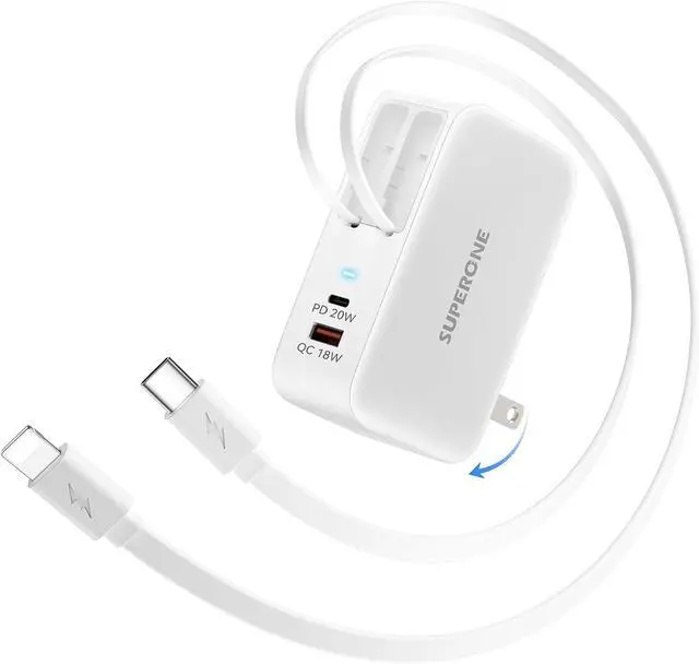 [90cm Dual Retractable Cable Charger] Are you tired of dealing with the hassle of charging cables? SUPERONE retractable wall charger uses a special design with two cables that can be adjusted to different lengths. It comes with the longest Type-C and cables on the market up to 35.4 inches (90 cm) you can always charge your devices with ease and comfort. When you're done simply pull out 1 cm of cable to neatly store it away. The cable length and adjustable design make it a breeze to use. [78W Upgraded 4-in-1 Fast Charger] The retractable phone charger can charge four devices simultaneously with a total output power of up to 78W including an integrated 20W USB-C port a 20W retractable cable a 20W USB-C and an 18W USB-A port; It supports fast charging protocols for all ports charging your iPhone 16 Pro Max to 60% in just 30 minutes3X fast charge than 5w charger.