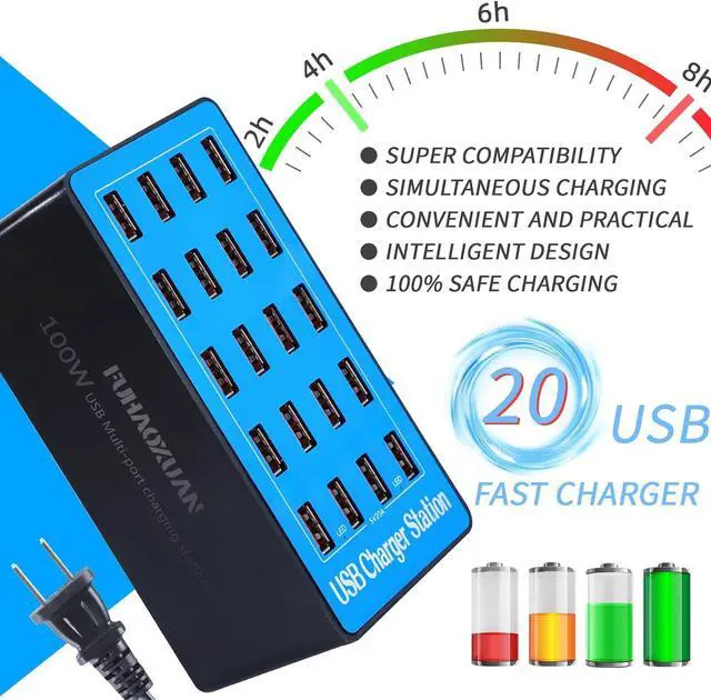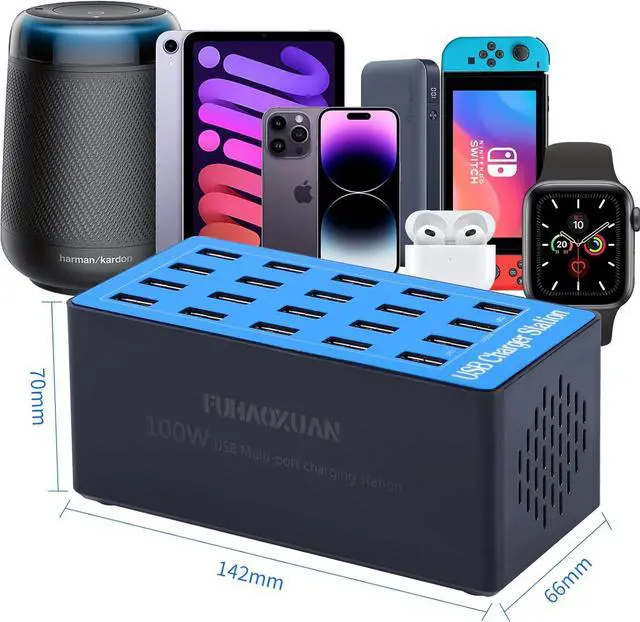 Devices Simultaneously: This multiple USB charger station supports up to 20 devices at once. Compatible with iPhone Galaxy tablets Headphones and more. Each port delivers up to 2.4A for efficient charging.