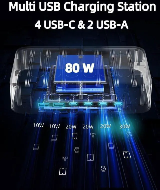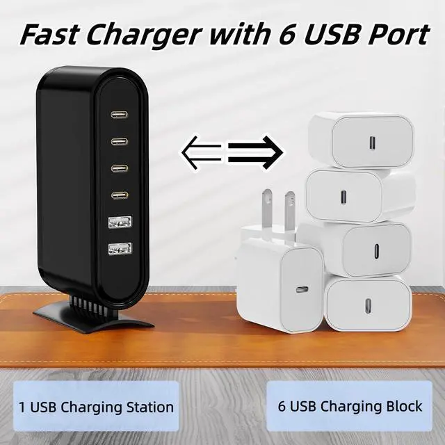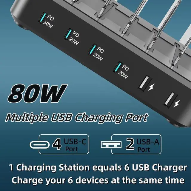 Note: It does not contain Type-A to Type-C cablesConvenient 6 Port USB ChargerThis Multi port USB C and USB A Charger Station perfectly charges multiple devices. The detachable 5ft cord for this multiple fast charger station can be extended to charging. It can be used in the home office and travel. Small size fits easily into pockets handbags travel cases. It is convenient for you to charging your iPhone 15 14 13 pro max and other type C type A devicesFast Charger StationMulti Fast Charging Station for 6 USB Charging Cables provide a 80W charger port which quickly and efficiently charge your type C or type A devices. It max output 2.4A faster charging stations than other regular multiple device charger stations of 2A the Multi Fast Charging Station allowing you to charge your phone up to 50% in just 35 minutesWhat You GetYou will get a Multi port USB chargers for your type C and type A devices. If you have any problems this product please contact us and we willing reply you as soon as possible