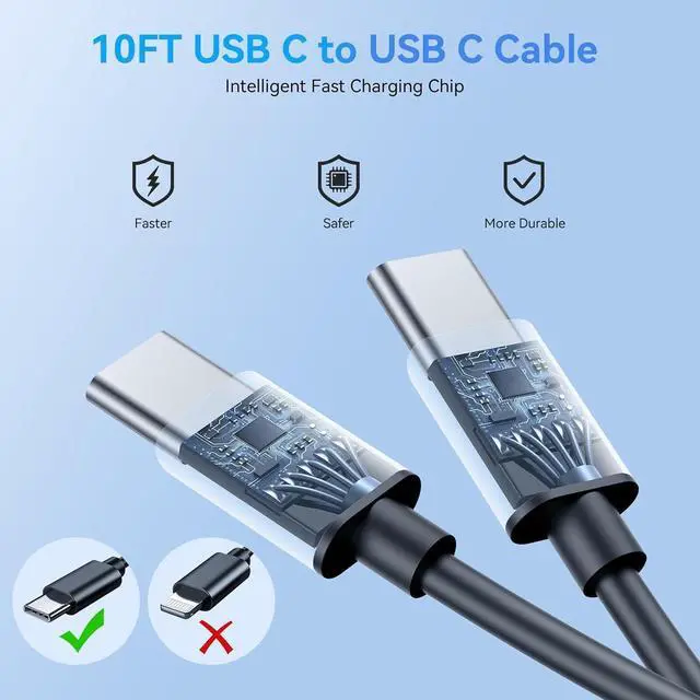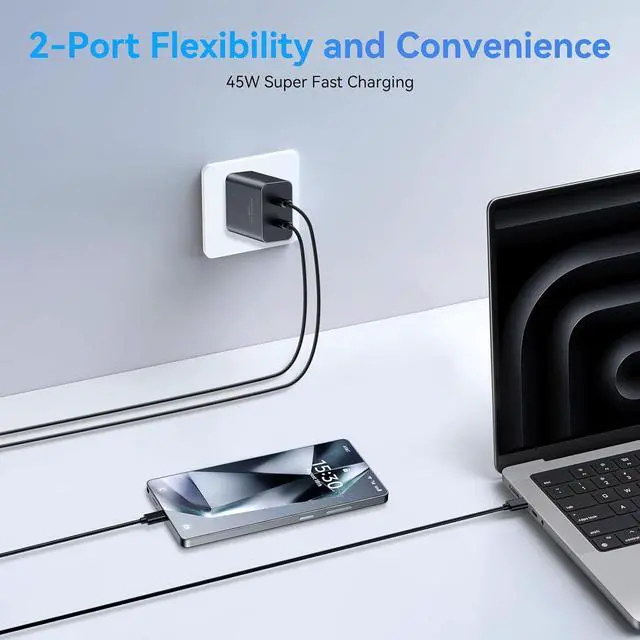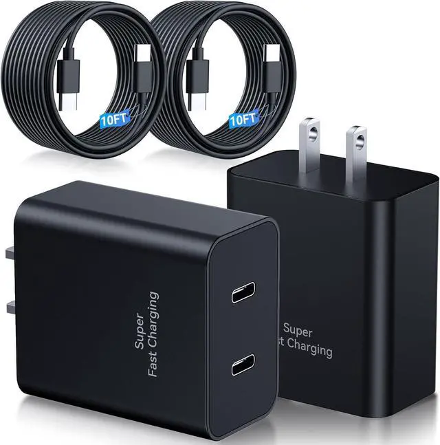 10FT Long Charger Fast Charging CordThe 45W Super Fast Double Type C Android Phone Charger Block is Equipped with Extra Longer 10FT USB C Charger Fast Charging Cable Cord offering Long Charging Distance USB C Charger Cable up to 480 Mbps Data Transfer Speed. 2Pack Fast Wall Charger can Charge Two Devices Simultaneously Provide the Ultimate Convenience 10 Feet Extra Length Allows you to Freely Charge your Phones/Tablets From any occasions Like on Sofa/Bed or at office. 45W Wall Charger Safe and ReliableThis 45 Watt Super Fast Charger Plug Power Adapter Multiple Built-in High Quality Chips Protect Your Devices From Over Heating Short-Circuiting and Over Charging.