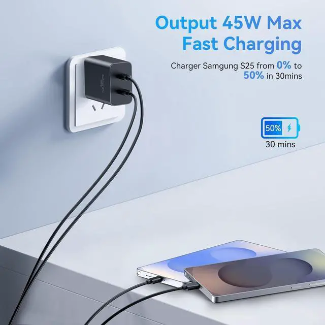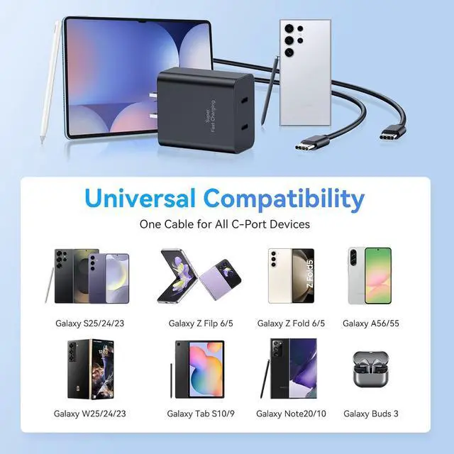 45W Super Fast ChargerThe 45 Watt Super Fast Charger Dual Ports USB Type-C Charger Fast Charging Block for Adopts Latest Fast Charging Technology to Provide Compatible Devices With Maximum Power of 45W independently Shunted Without Degradation. 2-Port Super Fast USB C Charge Power Adapter from 0% to 50% in Just 25 Min More Faster than other 25W/15W Chargers. Fast Phone Charger Wide Compatibility USB C Charger Power Adapter for Galaxy S25 S25+ S25 Ultra S24 S24+ S24 Ultra S24 FE S23 S23+ S23 Ultra S23 FE S22 S22+ S22 Ultra S21 S21+ S21 Ultra S21 Plus 5G S21 FE S20 S20 Ultra S20 FE S20+ A16 5G A15 5G A14 5G A13 5G A23 A53 5G A03s Z Fold 7 Z Fold 6 Z Fold 5 Z Fold 4 Z Fold 3 Z Flip 7 Z Flip 6 Z Flip 5 Z Flip 4 Z Flip 3 Note 20 Note 20 Ultra 5G S20 Plus Note 10 Note 10+ S10 S10+ S10E S9 Note 9 A54 A53 and More.