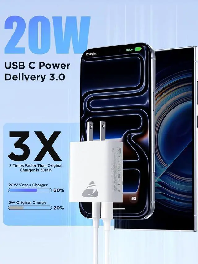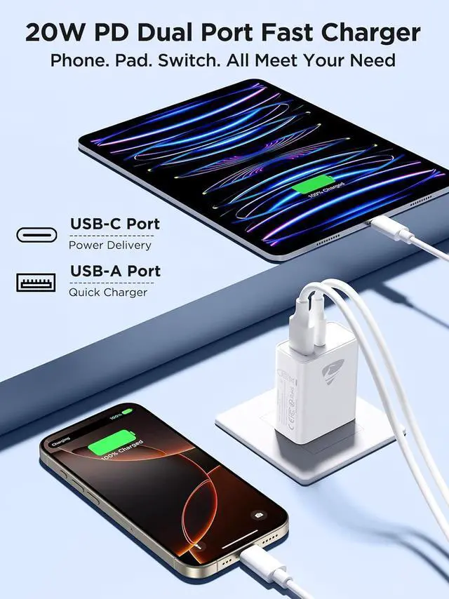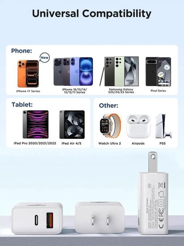 Charger blockUniversal Compatibility: This USB C charger block 20w supports virtually all mobile devices and is perfectly compatible with iPhone 17 Pro Max/16 16e/15/14/13/12/11/XS/XR/X/8/7/6/SE iPad Pro Air Mini iPod Galaxy Pixel LG Tablet Android Phone and moreSuperior