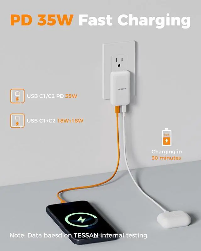 Dual USB-C Fast Charging: Equipped with two USB-C ports this Slim Multi-Port Power Adapter delivers up to 35W of power allowing you to charge two devices simultaneously at high speed. Compatible for iPhones Galaxy iPads and other USB-C compatible devices.