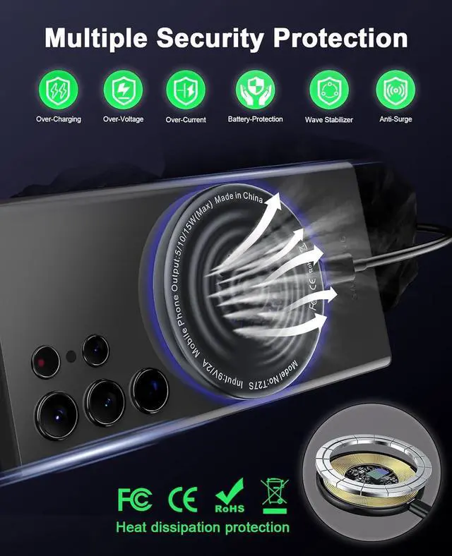 Efficient Cooling: Adopts the latest chip passed FCC/CE/ROHS certification featuring overcurrent overvoltage overheating. In case of any abnormality the LED indicator will flash blue and green rapidly and automatically stop charging. Features honeycomb cooling vents on the back to dissipate heat effectively ensuring safe and stable chargingWide CompatibilityWorks with