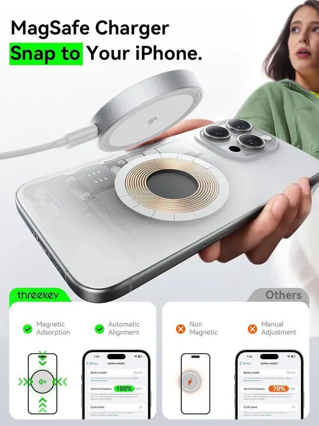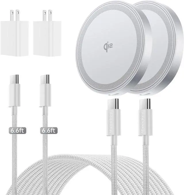 ?? Intelligent ProtectionSafe & Reliable ChargingThis MagSafe charger features high thermal conductivity graphene material and is equipped with a multi-layer heat dissipation structure effectively supporting heat dissipation. It also comes with multiple protection features including overheating protection foreign object detection and intelligent temperature control. When the battery reaches 80% it automatically switches to a charging mode with a trickle current to prevent overconsumption of the device's battery. This protects the battery while ensuring safe charging allowing you to sleep peacefully every night.?? Strong Magnets & Optimal Mag Safe AlignmentStable & Efficient Charging THREEKEY wireless charger features the super strong magnets which can hold your phone stable and eliminates the worry of your phone falling off (No slipping even when shaken). It can also provides optimal magnetic alignment for faster more efficient charging. Charge wirelessly and enjoy the freedom to switch between horizontal and vertical modes seamlesslyplay games or watch videos effortlessly while your phone charges.??? What You Will Get2* Qi2-Certified Wireless Charging Pad 2*20W PD Fast Charging Adapter 2* 6.6 ft USB Type-C to C Nylon Braided Cable and User Manual*1.?? 36-Month WarrantyThreekey offers 36-month warranty if you have any problem about the product please feel free to contact us.