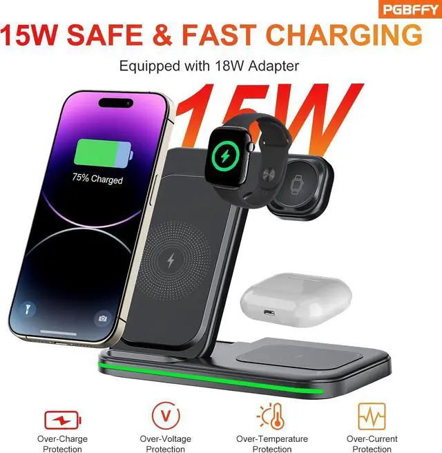 3 in 1 charging stationThis 3-in-1 wireless charger is designed to work seamlessly with multiple devices It lets you say goodbye to tangled cords and messy cables keeping your space neat and organized making it a convenient charging solution for your busy lifestyle. (Quick charger Included) Ultra-Fast