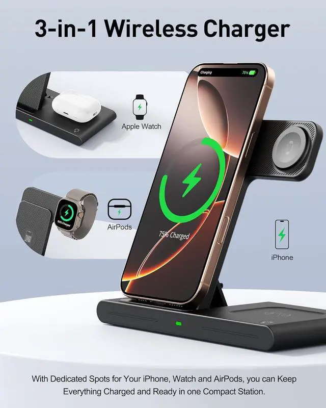 Portable Folding Design: charging station with foldable and lightweight design can charge up to 3 devices at the same time non-slip surface ensures that your device stays in place during charging ideal for home office travelling it provides fast and reliable power supply easy to put in your bag i Phone wireless charger say goodbye to clutter and hello to efficiency. A thoughtful gift for your loved ones/friends.