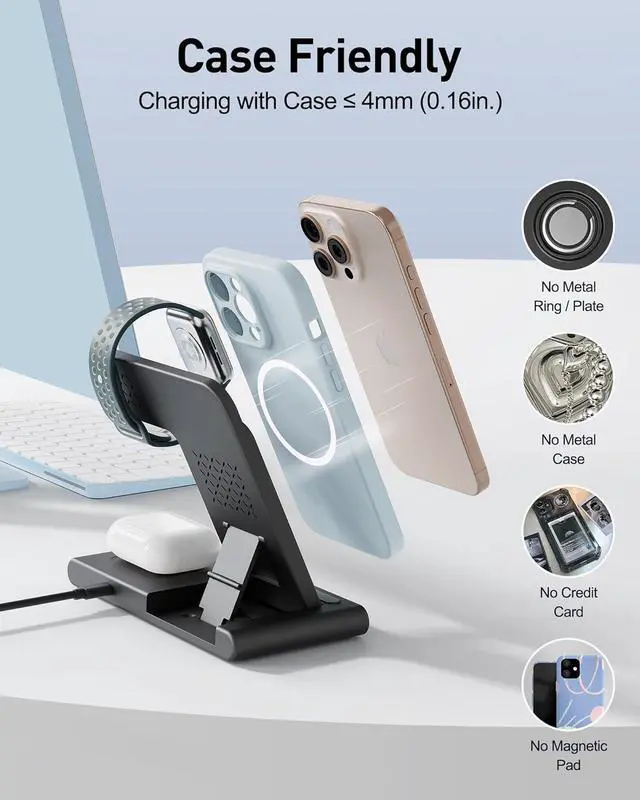 Wide compatibility: Wireless charger phone charging position without magnetic suction function for iPhone 17/16/15/14/13/13/12/11/12Mini/Pro/Pro Max/XS/XR/XS MAX/X/8/Plus/watch and headphones only support i Phone models iWatch 10/9/8/7/6/5/4/iWatch. 3/2/SE/Ultra/Ultra 2 and Air Pods 2/3/4/Pro/Pro 2 for