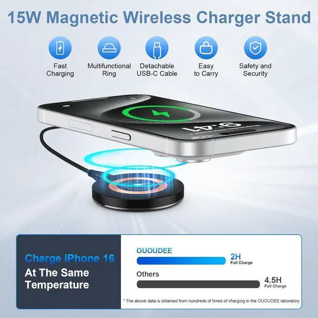 Strong Magnetic Suction: The iPhone 16 Pro magsafe charger stand Built-in strong magnet makes the charging snap. Put the magnetic charging pad close to the back of the phone ensures it sticks tightly to your iPhone 16/15/14/13/12 Series with metal ring can not only be used as a phone ring holder but also a phone charger stand! it will automatically and precisely adsorb and start charging immediately. You can switch the angle of the iPhone Mag-safe magnetic charger to meet your needs while charging.
