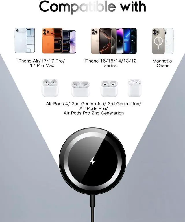 Please Note: A normal case will weaken the pull of the magnets in the iPhone and will not stick to the charger please use a Mag-Safe case???????????????????????????????????????????????????????? /???? /???? /???? /???? /????: Specially Designed for iPhone 17/17 Pro/17 Pro Max/Air/16/16 Plus/16 Pro/16 Pro Max/15/15 Plus/15 Pro/15 Pro Max/14/14 Plus/14 Pro/14 Pro Max/13/13 Mini/13 Pro/13 Pro Max/12/12 Mini/12 Pro/12 Pro Max and for Mag-Safe cases. Besides its compatible with all wireless-charging-enabled devices when laid flat so youll conveniently charge your AirPods other phones support wireless charging function and other accessories.???????????????????????????? &??????????????????????????: This Magnetic charging pad makes wireless charging a snap you don't have to worry about misalignment with the wireless charger. It can hold your phone securely and offer easy magnetic alignment promising a quick and effortless charging experience. Also it allows you to keep using your phone while it charges without the bother of the cable.????????????????????????????????: Built-in a 4ft cable the long cable allows you to comfortably charge and use your phone at the same time when you sit down at your desk or settle into bed no more feels like youre on a short leash to your wall outlet.??????????????????????????????: This magnetic phone charger with a slim profile and lightweight design make this the perfect charger for travel. It slips easily into a purse or carry-on. Made of aluminum alloy case features sleek and exquisite texture durability and better heat-dissipation. Perfect on your nightstand desk and even look good on your kitchen table.
