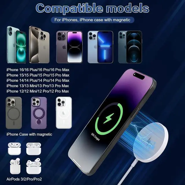 Customized for 16/15/14/13/12 Wireless iPhone ChargerThe magnetic wireless Charger iPhone specially designed for iPhone 16/ 16 Pro/16 Pro Max/ 16 Plus iPhone 15/ 15 Pro/ 15 Pro Max/ 15 Plus iPhone 14/ 14 Pro/ 14 Pro Max/ 14 Plus iPhone 13 series iPhone 12 series AirPods 3/2 Pro 2/Pro and iPhone models with Mag-Safe cases. The USB-C PD 20W charger could provide 20W for wired charging and Max15W magnetic wireless charging. 15W Magnetic Charger iPhone Induction Charging DesignWireless Charging Adapter Type C Fast Wireless Charger iPhone built-in superior magnetic attraction which keeps your iPhone 16/ iPhone 15 keep charging in place iPhone 3X faster than the original 5W iPhone charger supports 5W 7.5W 10W and Max 15W wireless charging feel free to charge your iPhone 16/15 anywhere.