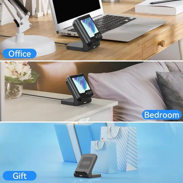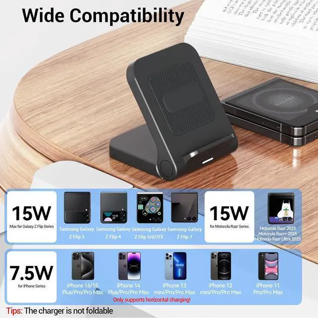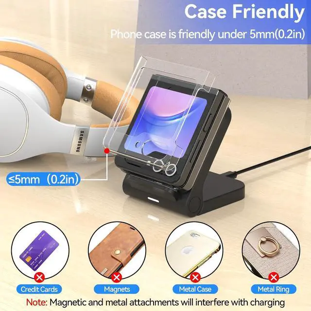 Wide CompatibilityGalaxy Z Flip wireless charger is well designed for user with the Galaxy Z Flip range of phones. Perfectly compatible with Galaxy Z Flip 7/Galaxy Z Flip 6/Galaxy Z Flip 5/Galaxy Z Flip 4/Galaxy Z Flip 3 for Motorola Razr 2025/Razr+ 2025/Razr Ultra 2025/Razr 2024/Razr+ 2024Easy to CarryThe Galaxy Z Flip wireless charger is very small. Unique design to make your travels convenient. This charger takes up little space. Especially easy to store in the office or at home (Note: The charger is not foldable)Fast Charging15W Wireless Charger greatly improves charging speed. This wireless charger for z flip features overcharge protection overcurrent protection and overvoltage protection to ensure charging safelyProtective Tail PlugWireless charging of mobile phones requires much less wear and tear on the phone's data port as the charging cable does not need to be plugged in and out as often. At the same time the coil of wireless charging for cell phones is not exposed to the outside which also reduces the damage of the charging deviceAttention Phone Case and Other Phone ModelsIf your phone case is more than 5mm or has a metal object such as a keychain it may not charge. When you charge a phone other than the z flip series you need to place the phone sideways to charge itWhat's in The Box1 x Z Flip Series Wireless Charger 1 x QC 3.0 charging adapter 1 x USB Type A-C Cable ( 39.4 inches) 1 x User Manual