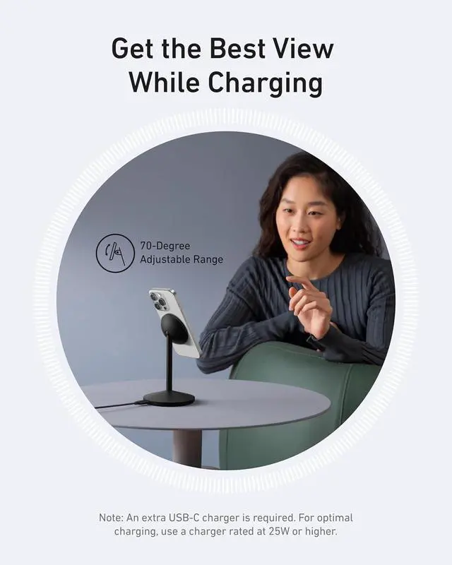 Adjustable Charging Surface: The wireless charger features a patented 360° rotating mechanism for seamless orientation changes and an adjustable tilt for the perfect viewing angle.