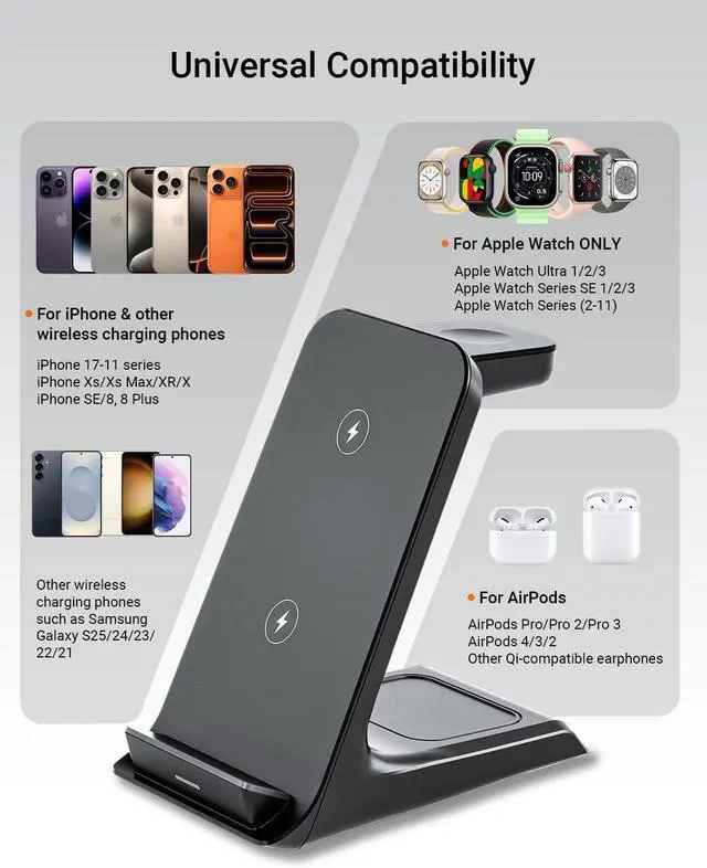 Charging Station: The wireless charging station for multiple devices can charge your iPhone Watch and AirPods simultaneously. Say goodbye to tangled cords and plug in or out troubles. Perfect wireless charger for iPhone 16e/16/16 Plus/16 Pro/16 Pro Max/iPhone 15/15 Plus/15 Pro/15 Pro Max/14/13/12/SE/X/11/8 series Galaxy S25 Ultra/S25+/S25/S24/S23/S22 and other qi Phones. Great iWatch charger stand for Watch Ultra 2/Ultra/10/9/8/7/6/5/4/3/2/SE /4/3/2 (Wireless Charging Version) Popsocket