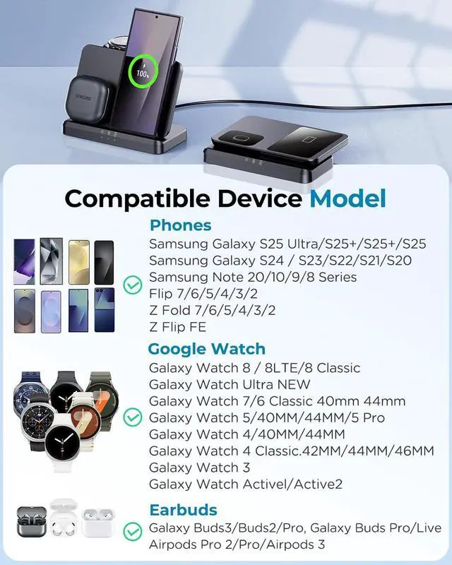3 IN 1 WIRELESS CHARGING STATION FOR All-in-one wireless charging station compatible with Galaxy S25 Ultra/S25+/S25/S24 Ultra/S24+/S24/S23/S22/S10/Note 20/Z Flip7/Z Fold6 Galaxy Note 20/10/9/8 Galaxy Watch Ultra/8/8 Classic/7/6/6 Classic/5/5 Pro/4/4 Classic/3/Active 1/2 and Galaxy Buds/Pro/Live (wireless charging case required). DETACHABLE USB-C GALAXY WATCH CHARGER Works with USB-C ports laptops power banks and adapters. Allows independent charging for your Galaxy Watch anytime. Compact and portable perfect for travel and business trips. Not compatible with Watch Gear Fit or Live series. CASE-FRIENDLY & MULTI-PROTECTION Works with 5mm phone cases such as silicone clear and magnetic cases. Charging without removing the case.