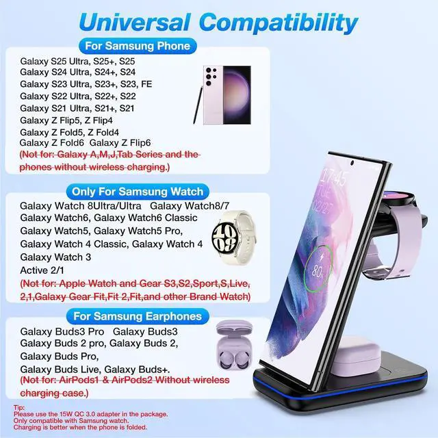 [Universal Compatibility]: Support up to 10W fast wireless charging Suitable for Galaxy Z Flip6/ Fold6/ Z Flip5/Fold5/ Z Fold 4/Flip 4/ Z Flip4 Bespoke Edition/ Z Flip 3/ Z Fold 2 For Galaxy S25 Ultra/ S25+/ S25/ S24 Ultra/ S24+/ S24/S23 Ultra/ S23+/ S23/ S22/ S22 Ultra/ S21/ S21+/ S21 Ultra/ S20/ S20+/ S20 Ultra for Galaxy Watch Ultra Galaxy Watch8Ultra Galaxy Watch8 Galaxy Watch7 Galaxy Watch6 Galaxy Watch6 Classic Galaxy Watch5 Galaxy Watch5 Pro Galaxy watch 4/Classic Galaxy watch 3/LTE for Galaxy Buds3 Pro Galaxy Buds3 Galaxy Active 2 LTE/2/1 Galaxy Buds 2 pro. (A built-in magnet that pulls the watch into proper position). Suitable for Galaxy Watch Ultra Galaxy Watch8 Galaxy Watch7 Galaxy Buds3 Pro Galaxy Z Fold7/6. Charges Only Watches Not Compatible with or Other Brand Watches. Ensure your phone earbuds & watch support wireless charging.