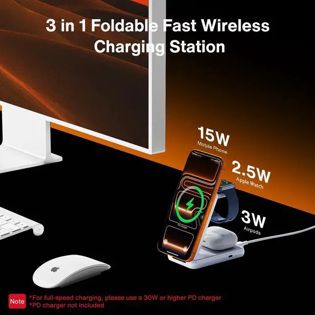 [Note: For max speed use a PD charger with an output of 30W or higher. ]Portable and Travel-Friendly DesignThis charging station is the perfect travel buddy. It folds up super compact and is super lightweight so it fits right into your bag without adding any bulk. Whether youre working remotely or hitting the road it keeps your devices charged and organizedno hassle all convenienceMulti-Function Travel Charging StandThis charging stand not only charges your devices but also works as an adjustable phone holder. You can prop up your phone at just the right angle to watch videos FaceTime or text without any strain. Its all about making your trips easier and more enjoyableQuality Assurance and Customer ServiceThis 3-in-1 charging station is all about safety and stability. Its equipped with overcurrent overvoltage and overheat protection. Plus it features a 4100GS super-strong magnetic force that locks your device in place keeping it secure and preventing it from falling off. NoteIVANKY offers a 24-month warranty and responsive customer service. If you encounter any problems with the charger we will be glad to replace it with a new one?