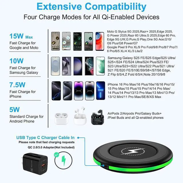 Case FriendlyOnly 5mm thickness of edge-cushions your phone with its silicone surface ring and base keep your iphone 16 pro max 16e 16 plus 15 series securely in the right charging place. Use wireless charging pad for moto g stylus 5g 2025 Razr+ 2025 edge 2025 without removing your favorite case. From soft cases made of Silicone or TPU to hard cases made of PC or Carbon are all compatible unless its thickness is over 5mm. For better charging experience please use a QC charger adapter. What You Get1-Pack 15W Wireless Charger Dock Fast Charging Pad Wireless Android Phone Charger Fast Charging Station 3FT Detachable USB A to USB Type C Fast Charging Cable Android Phone Power Cord.