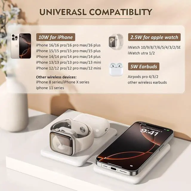 It is also compatible with Watch 10 9 8 7 6 5 4 3 2 Ultra 2 1 & 4 3 2 with magsafe charging case. Portable design for easy lifeDue to the compact and foldable design of the charger pad it is more suitable for travel home office and other scenarios than other wireless chargers on the market really a great space saver. Also when not using you can fold it up and takes up even less space very easy to carry with suitcases backpacks handbags etc. so it's on the travel must-haves list. Fast Magnetic wireless chargingThe foldable charging pad's strong magnetic suction ability allows your device to be easily aligned with the charging area accurately matching your phone and watch to ensure a stable connection to your device.