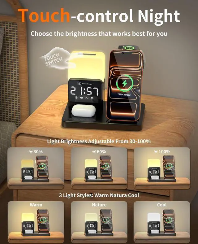 Alarm Clock & Night Light: This wireless charger features a digital alarm clock and a customizable night light. Customize your space with adjustable warm/cool lighting. Light Brightness Adjustable offering three brightness levels (30%-60%-100%) Long press to adjust brightness. - perfect for creating the right ambiance in your domestic use areas. For alarm settings please see the tutorial on the product details pageAdvanced Safety Protection +