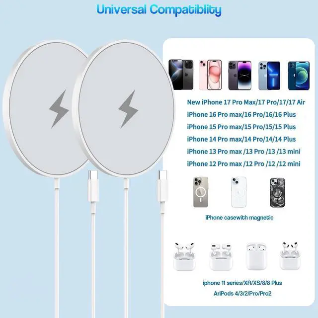 [Universal Compatibility]: Our 2 pack iPhone15 wireless charger uses the latest system easy to connect and more convenient for wireless charging. Especially suitable foriphone new iPhone 17/17 Air/17 Pro/17 Pro Max iPhone 16 Pro Max/16 Pro/16 Plus/16 15 Pro Max/15 Pro/15 Plus/15 14 Pro Max/14 Pro/14 Plus/14 13 Pro Max/13 Pro/13/13 Mini 12 Pro Max/12 Pro/12 Mini/12 iPad iPad Pro iPad Air iPad Mini and iPhone 8 above models with Mag-Safe case also supports magnetic charging.