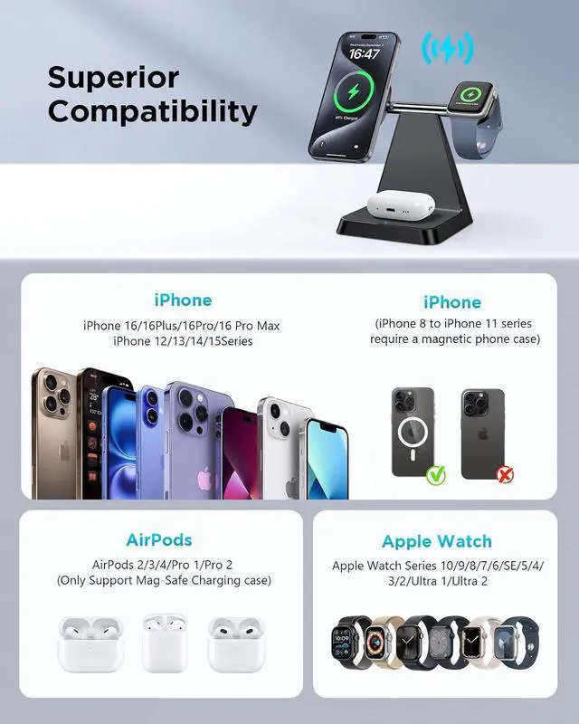 Multi Device: Just one cable to charge iPhone AirPods and Watch simultaneously; Compatible with iPhone 16/16 Plus/16Pro/16 Pro max/15/15 Plus/15Pro/15 Pro max/14/14 Pro/14 Plus/14 Pro Max/13/13 Pro/13 Pro Max/12/12 Pro/12 Pro Max (iPhone 8 to iPhone 11 series require a magnetic phone case); Also compatible with Watch Series 10/9/8/7/6/5/4/3/2/1/SE/Ultra 1/2 with wireless charging capability and AirPods.