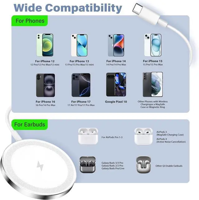 USB-C/A Dual Ports Included: Equipped with both USB-C and USB-A cable options for flexible charging setups. Use with laptops desktop adapters or travel chargers with ease. Fully compatible with iPhone 17/16e/16/15/14/13/12 series AirPods 4/3/2 Pro Google Pixel 10 series (Qi2 magnetic) and Galaxy S25 series with Qi2 Ready cases. Extra-Long Cable for