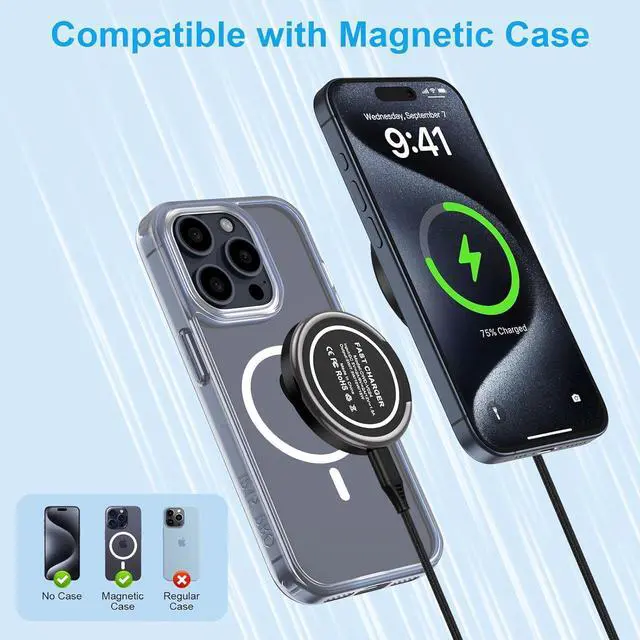 Note: The magnetic function is just for iPhone. For other phones without magsafe function must use our metal ring to fit. 15W Fast Wireless Phone Charger PadWireless Charging Station fast charge for Galaxy S25 Ultra/S25 Edge/S24 FE Z Fold 7/6/5 Z Flip 7/6/5 S24 Plus/S24 Ultra/S23 FE/S23+/S22/S21 FE/S20/S10 Note 20/10; iPhone 16 Pro Max 16 Plus 16e 16 16 Pro 15 15 Plus 15 Pro Max; Google Pixel 9 Pro Fold/9 Pro XL/9/8a/8/8 Pro/7 Pro/7/6 Pro/6/5/4XL/3 XL; Moto G Stylus 5G 2025 Razr+ 2025 Razr 60 Ultra Edge 2025 G Power 2025 Edge 60 Pro G 2025 Edge 5G UW G Pure G Play G10/G9 Plus; LG V60 ThinQ V50 V 40.15W Magnetic Suction Wireless Charger for AndroidThe built-in strong magnetic of this iphone 16 wireless charging mat makes the charging snap. Engineer tested charges from 0 to 100% in just 2 hours and can charge galaxy z fold7 s25 ultra s25 plus s25 edge s24 fe s23 up to 50% in half an hour 3 times faster than 5W charger. A built-in smart chip protects your device from overheating overcharging and short circuits. For better charging experience please use PD Adapter (INCLUDE).