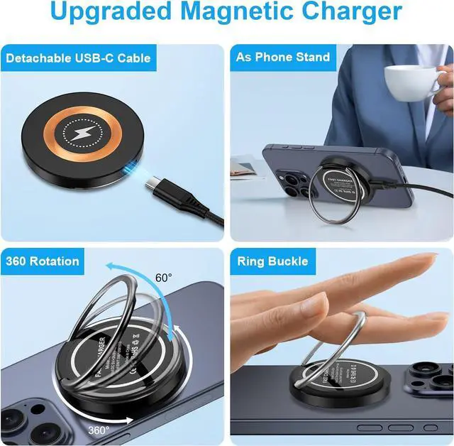 Note: Please ensure your device support wireless charging and ensure your device on the center of the wireless charger pad. Wireless Android Phone Charger Pad with KickstandThe lightweight design makes it easy to carry and can be placed in a pocket or handbag. Sleek Compact design with non-slip rubber. The google pixel 9 pro xl 9 pro fold 8 wireless charger with metal ring not only be used as a charging but also a phone stand is easily adjusted between 0°~60° features a durable double-jointed ring holder. A high speed galaxy s25 wireless charging dock can be easily carried during travel or business. What You Get1-Pack 15W Magsafe Wireless Charger Dock Magnetic Fast Charging Pad 1-Pack 3ft USB C to USB C Fast Charging Cable Android Phone Power Cord (20V/3A 480 Mbp/s) 1-Pack 20W PD USB C Fast Charger Block. 12-month Worry-free Warranty fast and easy-to-reach Customer Service to resolve your issues. If you are not satisfied with our galaxy s25 ultra s25 fe s25 edge s24 fe s24 ultra s23 plus iphone 16e 16 plus 16 pro max charger please reach out to us. We will reply to you ASAP.