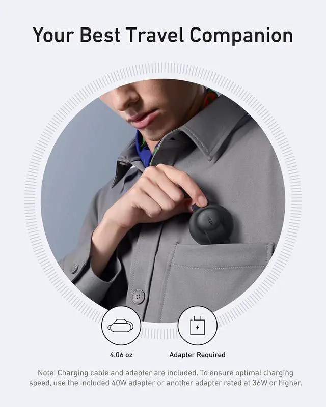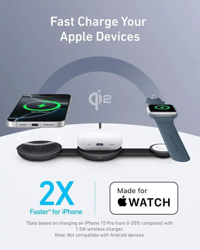 Travel-Friendly and Ultra-Portable: Take the convenience of wireless charging anywhere with a foldable baseball-sized Qi2 3-in-1 charger.