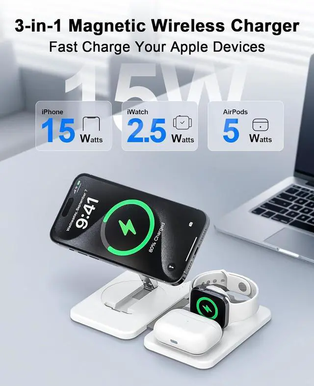 Devices: This fast 3 in 1 magnetic wireless charger can power your iPhone watch and AirPods simultaneously. for iPhone 17 16 15 14 13 12 Plus /Pro/