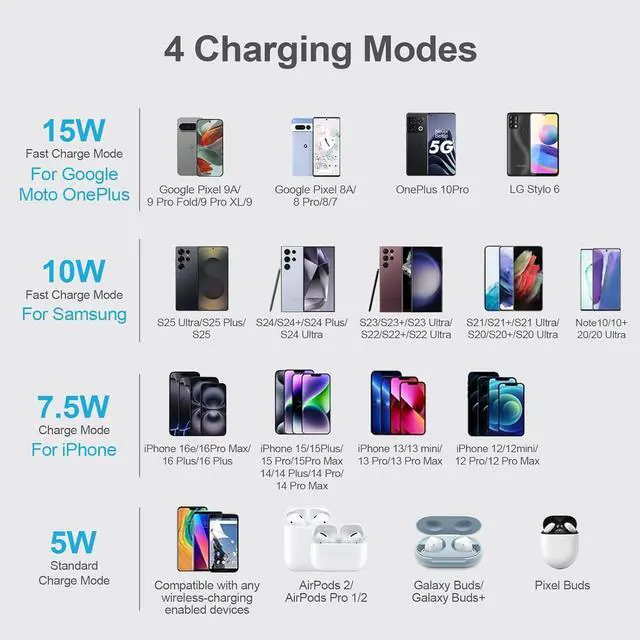 Different Phones: 15W iphone wireless charge is for Galaxy S25 Edge/S25 ultra/ S24 FE/Ultra/S24+/S24/S24 Plus/S23 Ultra/S23+/S23/S22 Ultra/S22. Z Flip 6 5 4/Z Fold 6 5 4 5G (Do not fit Galaxy A Series) iPhone 16e/16/16 Plus/16 Pro/16 Pro Max/iPhone 15/15 Plus/15 Pro/15 Pro Max/14 Plus ProMax/13/12 with latest iOS System; Google Pixel 9a/9/8Pro/8/7/6 5W wireless charger pad stand works on Any wireless charging enabled devices like wireless earbuds.