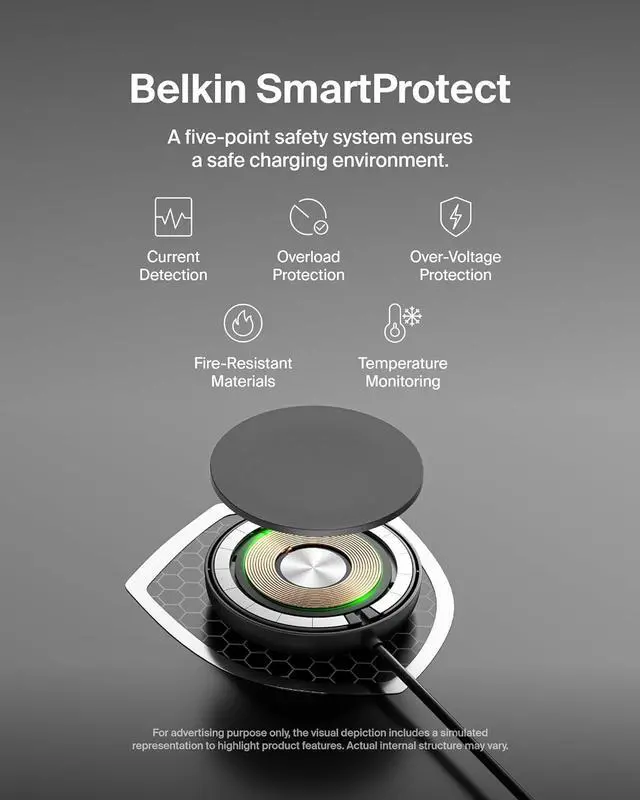 SAFE CHARGING: The advanced protection of Belkin SmartProtect ensures the following safety features: temperature monitoring over-voltage protection current detection overload protection fire-resistant materials and foreign object detection. SUSTAINABLY MADE W/ 2-YEAR