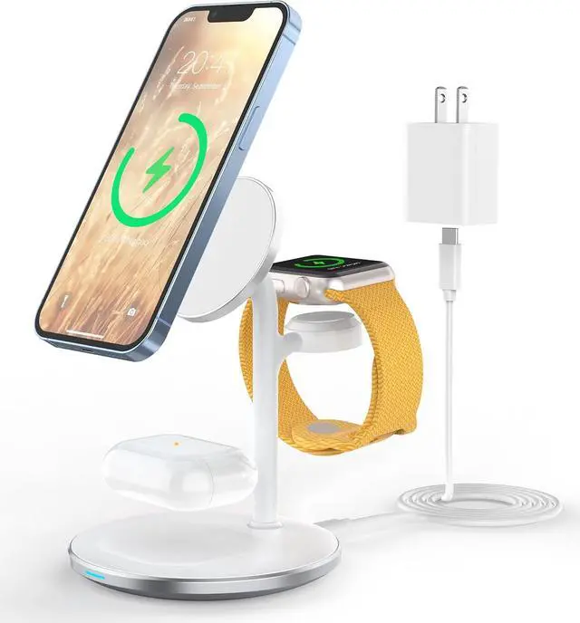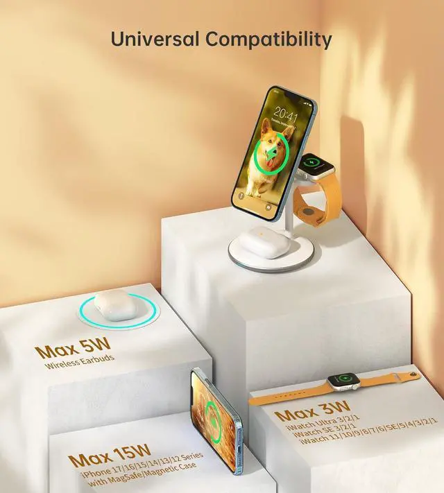 Wide Compatible Charging Station: This 3 in 1 wireless charging station stand acts like a mini hallstand holding and charging your iPhone 12-17 series(without case or with MagSafe/Magnetcic case) Pixel 10 series Watch and 4/3/2 (Only for wireless charging box version) in one place helping you end the messy cord life and tidy your desktop. A must-have 3 in 1 charging stand for different charging options as you need.???????????????????????????????????????? &??????????: Simple and elegant design make this magnetic charging station is not only a Place-Saving beside desktop charging stand but a pretty desk tidy gift for your boy/girl friends and family.????????????????????: 3-1 Wireless Charging Station; 20W QC 3.0 Charger; Type C Fasting Charging Cable( 1.5 m/5ft); User Manual; 24-Month Warranty & 24-hour Customer Service.