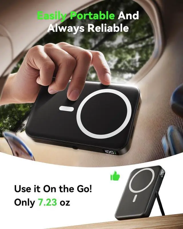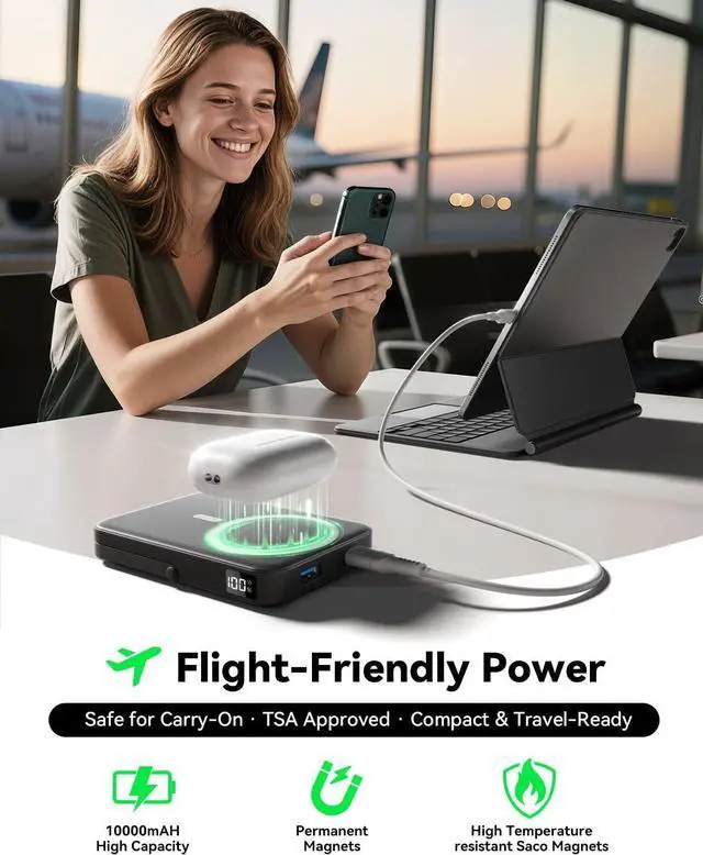 LED Display and Smart ProtectionThe magnetic portable charger sleek LED display provides real-time battery percentage so youll never run out of power unexpectedly. Built-in multi-layer safety protection system guards against overcharge over-discharge short circuit and overheating. Certified with FCC/CE/ROHS ensuring safe and reliable charging anytime. Slim and Portable for TravelUltra-slim for magsafe power bank fits easily into your pocket or handbag making it the ideal portable charger for iPhone 17/16/15/14/13/12 series. With 10000mAh capacity its approved for carry-on during flights and perfect for work travel or outdoor adventures. The matte anti-fingerprint finish adds a clean professional look to this wireless charger keeping it stylish wherever you go.