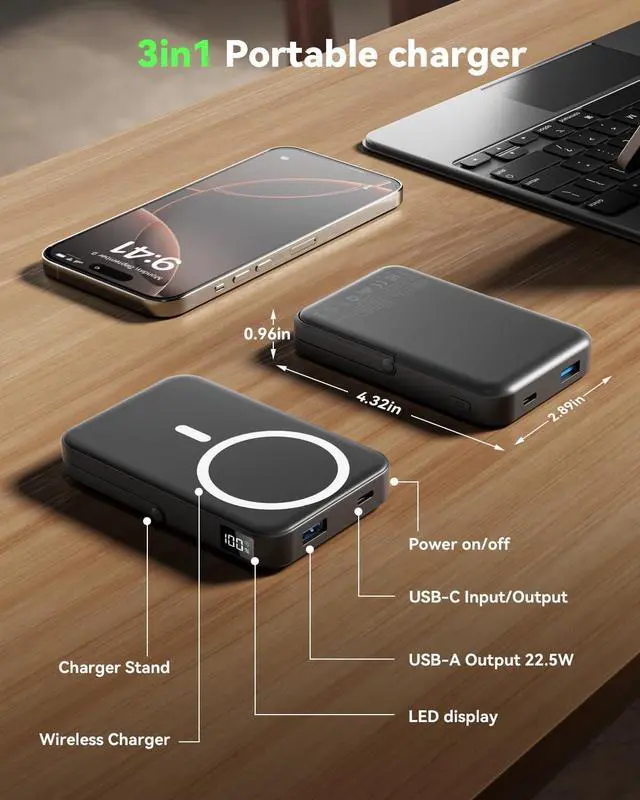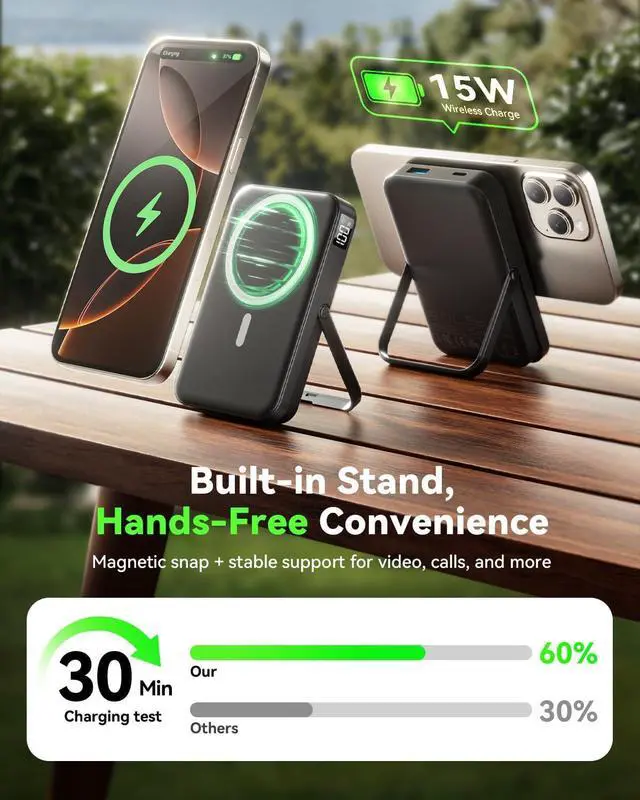 Foldable Stand for Hands-Free UseEquipped with a sturdy foldable stand this wireless charger for MagSafe iPhone easily transforms your device into a mini workstation or entertainment screen while charging. Use it vertically for FaceTime or horizontally for Netflix. More than just a power bank its a practical portable charger that adds convenience to work travel or daily use. Dual Output with Wide CompatibilitySupports for MagSafe iPhones and wireless-charging-capable phones (with magnetic ring).