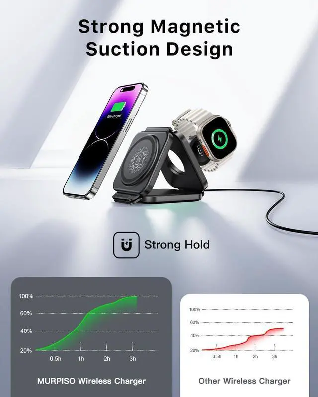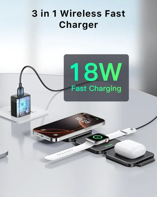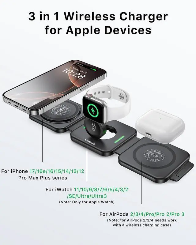 3 IN 1 Magnetic Wireless ChargerThe wireless charger stand has a soft silicone pad design that folds 180° and supports three charging modes. This 3 in 1 wireless charging station with strong magnetic design built-in high-quality magnets. Precise alignment with built-in magnets ensures a secure connection and reliable charging every time. No more misalignment or charging interruptions.. If you want to use the magnetic feature of this wireless charger make sure the phone model is for iPhone 12/13/14/15/16/17 series. More Suitable for TravelOur wireless charger come with a storage case and adapter so you can easily fold your wireless charging station into the storage case to avoid bumping and scratching your wireless charger while traveling.
