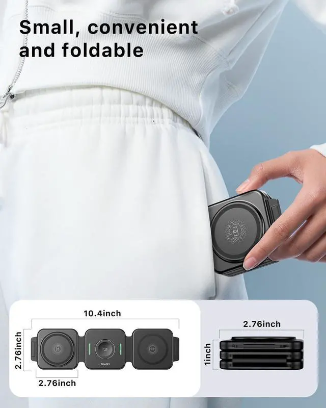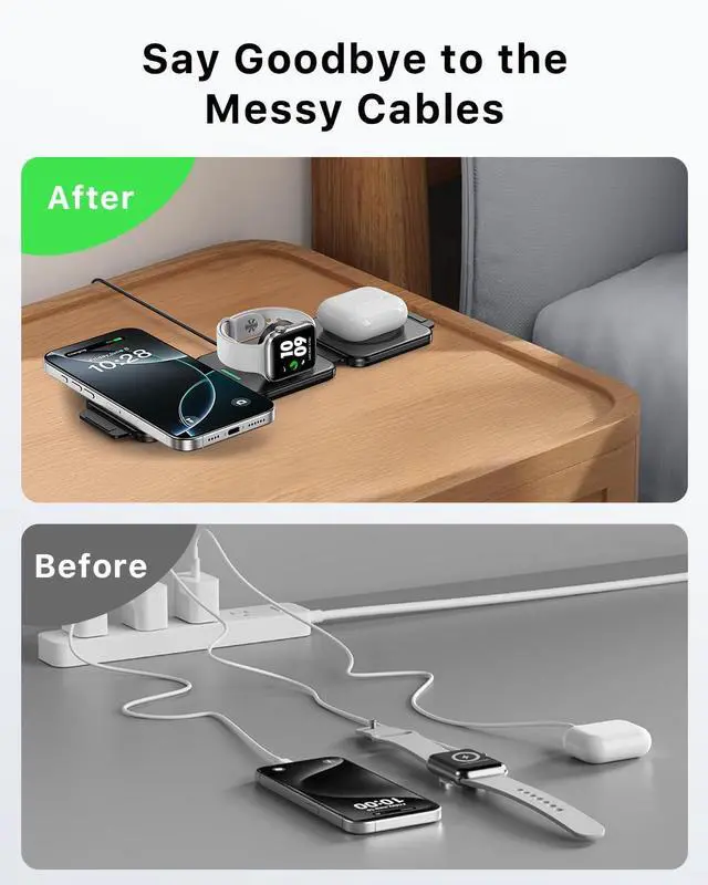 The wireless charging station adopts folding design more space saving and convenient storage and carrying is more suitable for going out to carry wireless charger! Wireless Charger for Your DeviceWireless charger for iPhone for Watch and for AirPods all at onceneatly and efficiently. No more cable clutter. Perfect for your home office or meeting room. Camera-Safe Elevated Design the wireless charging pad is thoughtfully raised to prevent contact with surfaces and protect your Phones camera lens. Enjoy gap-free stable charging with no risk of damage. Multiple Security ProtectionBecause the 3 in 1 wireless charger can charge three devices at the same time it pays more attention to the security protection function and protects the safety of the equipment.