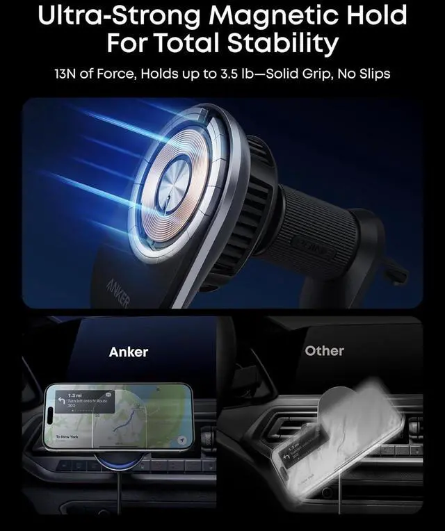 Any Road: Combines an ultra-strong 13N magnetic force and a locking vent hook to keep your phone stable through bumps and turns. Tested on eight rough road conditions your phone stays securely mounted without falling.
