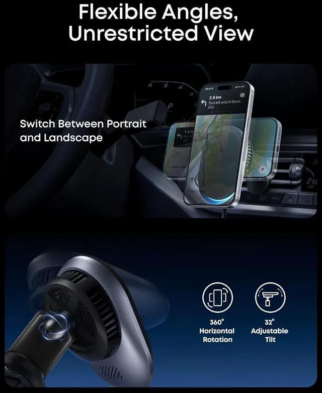 Perfect Angle: Switch between portrait and landscape modes with ease and fine-tune your viewing angle with ±32° tilt. No more blocked viewsjust smooth distraction? free navigation. Stays Put on